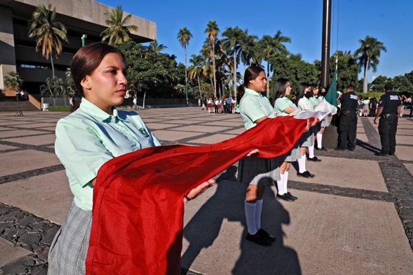 Culiacán, Sinaloa, 07 de noviembre del 2022.- Como parte del fomento cívico y del respeto a los símbolos patrios, autoridades civiles y militares realizaron un izamiento a toda asta con Honores de Ordenanza en la plaza cívica de Palacio de Gobierno.