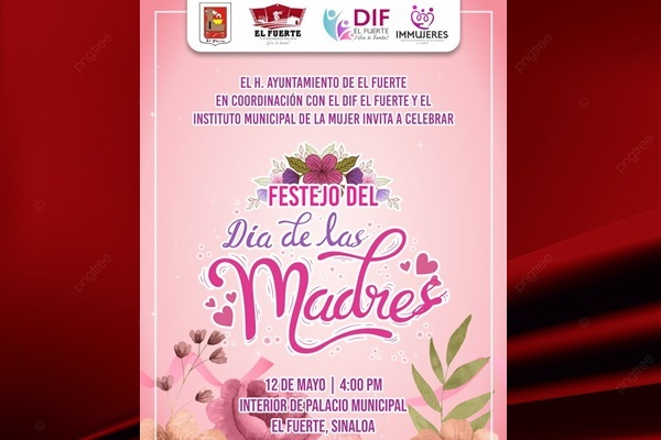 El Fuerte, Sinaloa, a 09 de mayo del 2023.- El H. Ayuntamiento de El Fuerte, a través del Instituto Municipal de las Mujeres, en coordinación con Sistema DIF El Fuerte, invitan a las madres de familia del municipio a que se unan a la celebración por motivo al Día de las Madres, la cual se llevará a cabo el día viernes 12 de mayo, en el interior del Palacio Municipal.