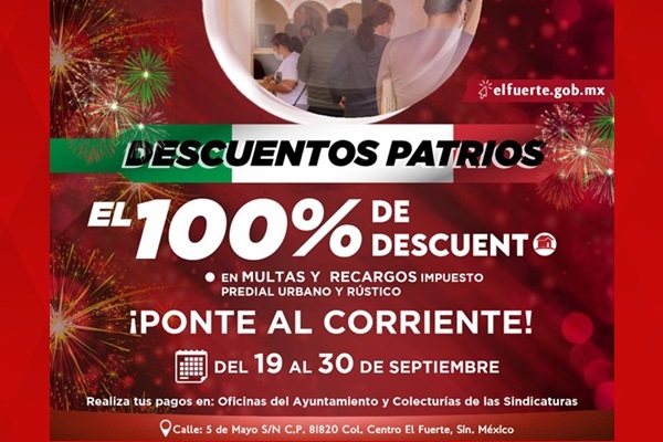 El Fuerte, Sinaloa, a 19 de septiembre del 2022.- Bajo las indicaciones del Presidente Municipal Gildardo Leyva Ortega, la Dirección de Ingresos, inició una campaña de regularización para usuarios usuarios morosos en el pago de impuesto de predial rustico y urbano, con un descuento del 100% en multas y recargos, del 19 al 30 de septiembre.
