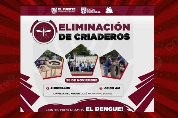 El Fuerte, Sinaloa.- La Dirección de Salud municipal de El Fuerte, hace a una atenta invitación a los habitantes de la comunidad de Los Hornillos, para participar en la jornada de Eliminación de Criaderos con el objetivo de prevenir las enfermedades del Dengue, Zika y Chikungunya.