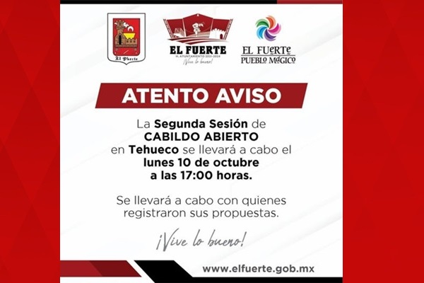 El Fuerte, Sinaloa, 07 de octubre del 2022.- El próximo lunes 10 de octubre, se celebrará en la comunidad de Tehueco, segunda sesión de Cabildo Abierto, donde se le invita a los ciudadanos de esta comunidad, acudir con sus solicitudes en mejora del pueblo, proyectos, mejora de áreas verdes, luz eléctrica, agua potable, en general temas de interés social en obra pública.