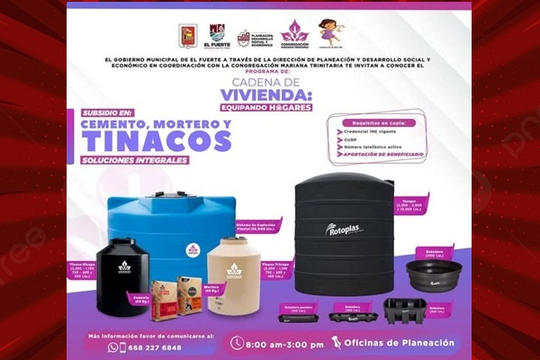 El Fuerte, Sinaloa.- El Gobierno Municipal de El Fuerte, a través de la Congregación Mariana Trinitaria, invita a la ciudadanía a acceder al apoyo de Cadena de Vivienda (Equipando hogares), el cual tiene como finalidad, brindar facilidades a la población en el almacenamiento del vital líquido y construcción a quien lo necesite.