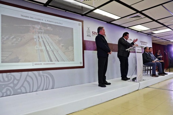 El secretario de Obras recordó que el puente original El Quelite fue derrumbado por la creciente del río que provocó el huracán “Nora” en septiembre del 2021, y en abril de 2022 el Gobierno Federal formalizó un convenio de asignación de recursos para que fuera el Gobierno del Estado el que convocara a licitación, la cual fue adjudicada a cuatro empresas distintas que se encargan de construir cada una un tramo de puente, cuya longitud es de casi un kilómetro en total en sus dos cuerpos.