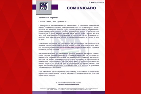 En el Partido Sinaloense, no compartimos los señalamientos de intromisión que ahora se señalan hacia nuestro instituto político, porque reiteramos que en nuestros principios y nuestros estatutos valoramos ser respetuosos de la vida interna de los demás partidos políticos.