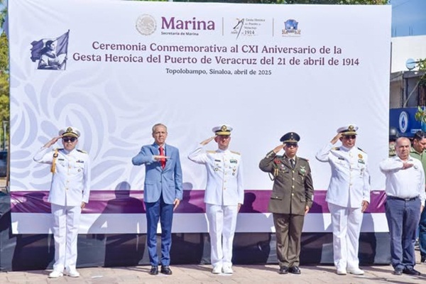Los Mochis, Ahome, Sinaloa. A 21 de Abril del 2025.- El Presidente Municipal Gerardo Octavio Vargas Landeros, acompañó a autoridades militares y navales en la ceremonia cívica del 111 Aniversario de la Gesta Heroica de la Defensa del Puerto de Veracruz, ocurrida el 21 de Abril de 1914, resultando México triunfante.