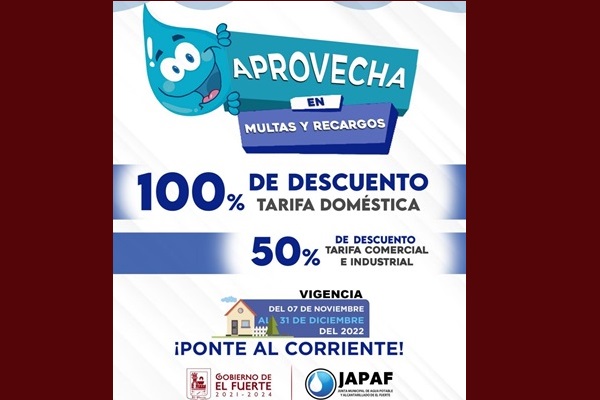 El periodo de promoción inicia hoy lunes 07 de noviembre hasta el 31 de diciembre del 2022, con descuentos del 100% en multas y recargos en tarifa doméstica, 50% en comercial e industrial.