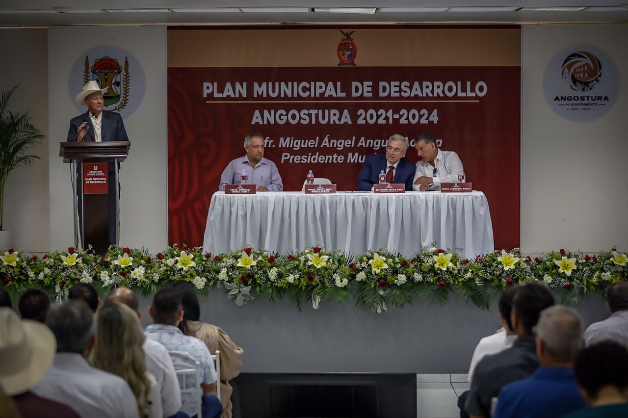 El mandatario estatal asistió al Auditorio del Ayuntamiento de Angostura para la presentación de este documento rector, cuyo ejemplar le fue entregado por el alcalde Angulo Acosta, lo mismo que al representante del Congreso del Estado, diputado local Ambrosio Chávez, así como al legislador federal Fernando García Hernández, en su calidad de invitado especial.