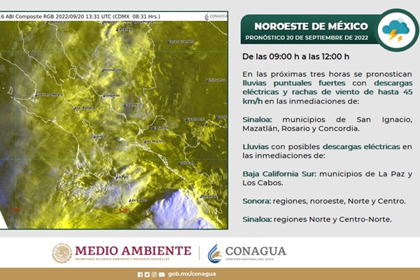 Es notable que en el sur del estado continúa latente la posibilidad de lluvias puntuales fuertes, especialmente en los municipios de San Ignacio, Mazatlán, Rosario y Concordia.