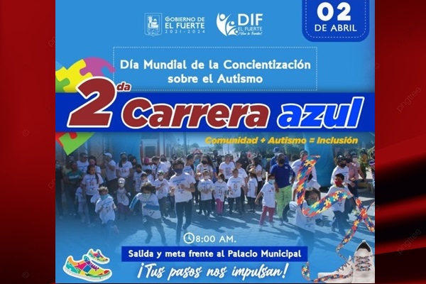 El Fuerte, Sinaloa, a 30 de marzo del 2023.- El H. Ayuntamiento de El Fuerte, a través del Sistema para el Desarrollo Integral para la Familia, hace una atenta invitación a la ciudadanía a participar el próximo domingo 02 de abril en la 2da. Carrera Azul, esto por motivo a la conmemoración del Día Mundial de la Concienciación sobre el Autismo, actividad que tiene como fin que la población tenga un acercamiento con las características del autismo y así empatizar con las personas que viven en el espectro y sus familias, y de esta forma contribuir a mejorar su calidad de vida y a participar en la sociedad en igualdad de condiciones.