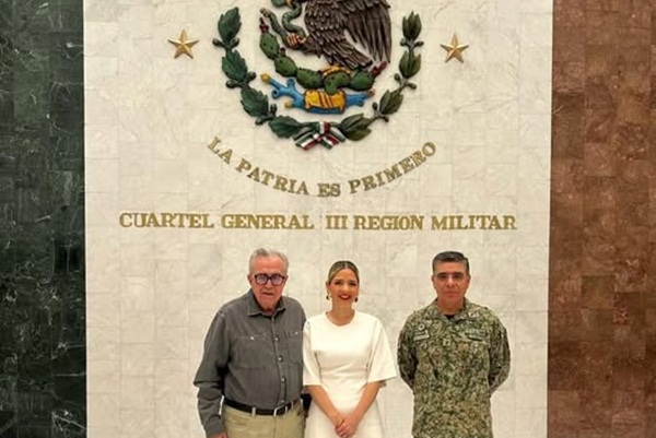 Mazatlán, Sinaloa, a 21 de marzo de 2025.- Durante su visita a Mazatlán donde encabezó la Mesa de Seguridad, el gobernador Rubén Rocha Moya fue recibido por la presidenta municipal, Estrella Palacios Domínguez, y por el comandante de la Tercera Región Militar, general de División, Guillermo Briseño Lobera, como anfitrión, ya que en estas instalaciones tuvo lugar la reunión de seguridad.