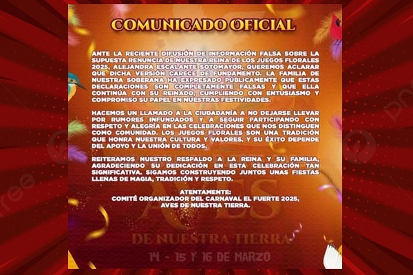 >> El Comité Organizador del Carnaval El Fuerte 2025, Aves de Nuestra Tierra, aclara a la ciudadanía que la información difundida sobre la supuesta renuncia de la Reina de los Juegos Florales 2025, Alejandra Escalante Sotomayor, es completamente falsa…