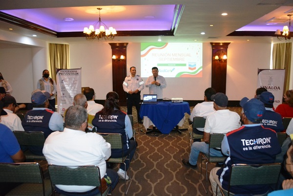Los Mochis, Ahome, Sinaloa, México. A 14 de septiembre de 2022. Personal de Tránsito Municipal de la SSYPC de Ahome, impartió la conferencia Manejo Preventivo a trabajadores de la empresa Servicios del Valle del Fuerte S.A. donde se contó con la asistencia de representantes de Programas Preventivos del Estado zona norte.