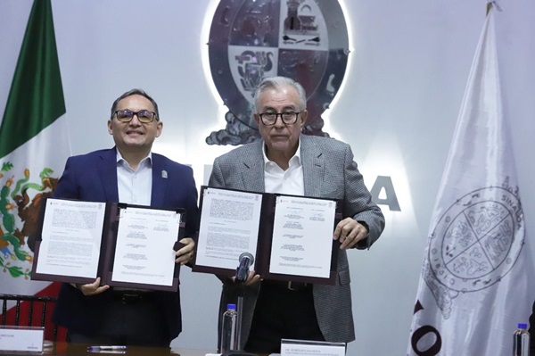 Culiacán, Sinaloa, a 10 de abril de 2024.- El gobernador Rubén Rocha Moya suscribió con el rector de la Universidad Autónoma de Occidente, Pedro Flores Leal, un convenio institucional que contempla la asignación de 30 millones de pesos, que se destinarán para el mejoramiento del equipamiento de cómputo y laboratorios, ampliar el acceso a la red de Internet en todas las Unidades Académicas y la rehabilitación de baños en diversas unidades, todo ello para ofrecer un servicio de calidad en beneficio de los 25 mil alumnos que cursan sus estudios superiores en esta institución.