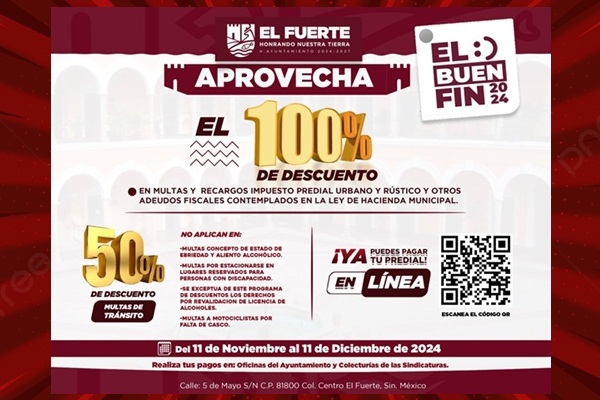 El Fuerte, Sinaloa, a 11 de noviembre del 2024.- El H. Ayuntamiento de El Fuerte, a través de la Dirección de Ingresos, pone a disposición de la ciudadanía diferentes promociones por motivo al Buen Fin. El periodo de descuentos aprobado se extiende del 11 de noviembre al 11 de diciembre, otorgando a los contribuyentes un 100% de descuento en multas y recargos de impuesto predial urbano y rústico, así como en otros adeudos fiscales establecidos en la Ley de Hacienda Municipal. Adicionalmente, se aplicará un 50% de descuento en multas de tránsito, excluyendo aquellas relacionadas con estado de ebriedad, estacionamiento en espacios destinados a personas con discapacidad y por la falta de uso de casco por parte de motociclistas.