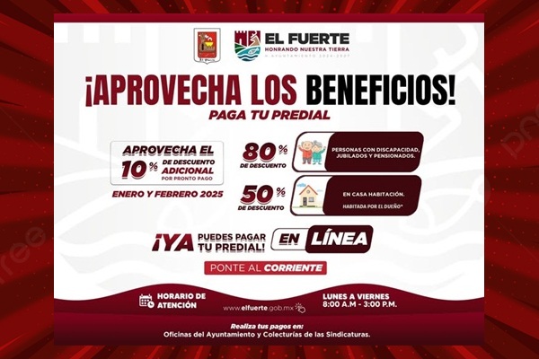 El Fuerte, Sinaloa, a 07 de enero del 2025.- El H. Ayuntamiento de El Fuerte, a través de la Dirección de Ingresos, pone a disposición de la ciudadanía, importes descuentos para el pago de predial urbano y rustico, además de incentivos por el pago oportuno de estas contribuciones.