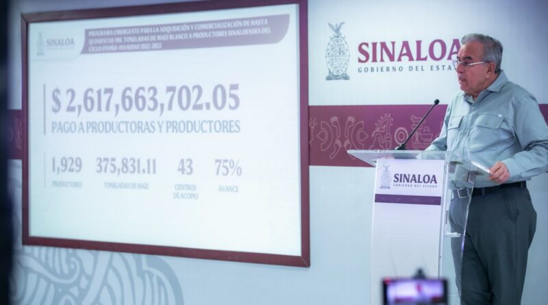 Culiacán, Sinaloa, 31 de julio del 2023.- El gobernador Rubén Rocha Moya, informó en su Conferencia Semanera que el programa de la compra de maíz por parte del Gobierno del Estado y Segalmex ya ha pagado a un 75% del total de productoras y productores del grano por parte del gobierno del Estado y un 64.58% por parte de Segalmex, lo que equivale a más de 11 mil productoras y productores atendidos de los 19 mil que son parte del programa.
