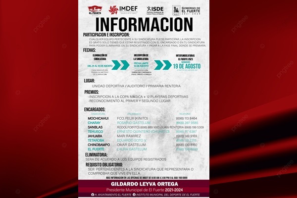 El Fuerte, Sinaloa. 02 de agosto de 2023.- Agosto llego y el deporte que sigue de los Intersindicaturas 2023 es Voleibol, asi que te presentamos la informacion para que participes y no te quedes fuera, cada sindicatura tiene su responsable y te puedes apoyar con ellos.