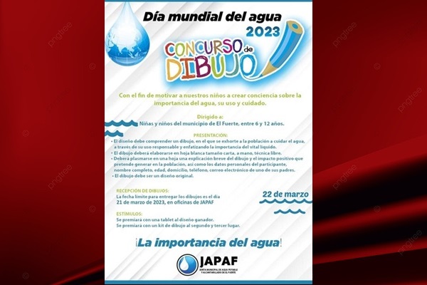 El Fuerte, Sinaloa, a 14 de marzo del 2023.- El Ayuntamiento de El Fuerte, a través de la Junta Municipal de Agua Potable y Alcantarillado, invita a las niñas y niños del municipio, a participar en el Concurso de Dibujo Infantil, que año con año se realiza en el marco conmemorativo por el Día Mundial del Agua. El objetivo de esta actividad es fomentar el desarrollo artístico de los niños y al mismo tiempo, trabajar en ellos la concientización sobre la importancia de cuidar el agua.