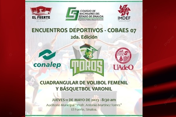 El Fuerte, Sinaloa.- Con motivos de los Festejos del Día Del Estudiante, el Plantel 07 del Colegio de Bachilleres del Estado de Sinaloa, llevará a cabo los Encuentros Deportivos COBAES 07 – 2da. Edición-, contando con la participación de los selectivos de Básquetbol y Voleibol de los planteles de Conalep El Fuerte y UAdeO Unidad Regional El Fuerte.
