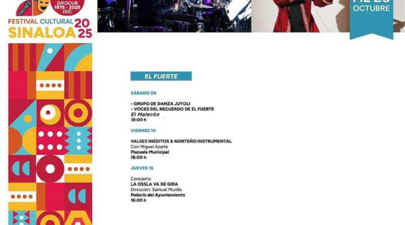 El Fuerte, Sinaloa.- El arte y la cultura llegan a nuestro municipio con grandes presentaciones dentro del Festival Cultural Sinaloa 2025, del 04 al 26 de octubre.