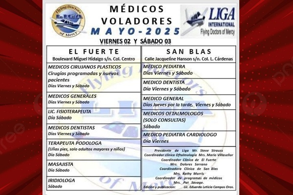 Los médicos voladores consultarán el día viernes 02 y sábado 03 de mayo del 2025, en la cabecera estarán ubicados sobre el Boulevard Miguel Hidalgo s/n colonia centro y en San Blas sobre la calle Jacqueline Hanson s/n colonia L. Cárdenas.