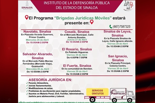 Culiacán, Sinaloa, a 25 de abril de 2023.- Como parte de la política estatal de otorgar certeza jurídica en distintos rubros, por instrucciones del Gobernador Rubén Rocha Moya, el Instituto de la Defensoría Pública del Estado de Sinaloa implementará el Programa «Brigadas Jurídicas Móviles» desde este miércoles 26 de abril y hasta el próximo viernes 28 del presente mes.