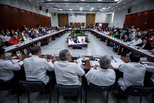 Culiacán, Sinaloa, a 14 de Octubre de 2022.- En las instalaciones del Congreso del Estado, en el marco de la reunión de socialización con legisladores locales de la minuta de reforma constitucional que contiene la ampliación del plazo para la coadyuvancia de la Guardia Nacional en tareas de seguridad, encabezada por Adán Augusto López Hernández, Secretario de Gobernación Federal y Moisés Ignacio Mier Velazco, Presidente de la Junta de Coordinación Política de la Cámara de Diputados, el Gobernador Rubén Rocha Moya, tras escuchar los distintos puntos de vista de las fracciones parlamentarias, planteó la importancia de construir consensos que permitan la permanencia de las autoridades federales en las labores de seguridad pública.