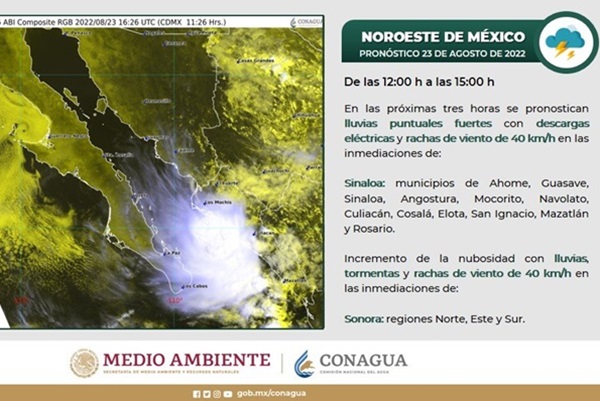 Félix Carrillo señaló que, de acuerdo al pronóstico de Conagua, es posible que en las próximas horas ocurran fuertes precipitaciones en los municipios de Ahome, Guasave, Sinaloa, Angostura, Mocorito, Navolato, Culiacán, Cosalá, Elota, San Ignacio, Mazatlán y Rosario.