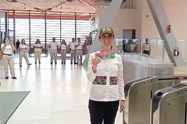 Sheinbaum Pardo recibió el boleto de ingreso a las instalaciones y, antes de pasar por el torniquete de entrada, posó para la foto con el ticket en mano y una gorra del Tren Maya.