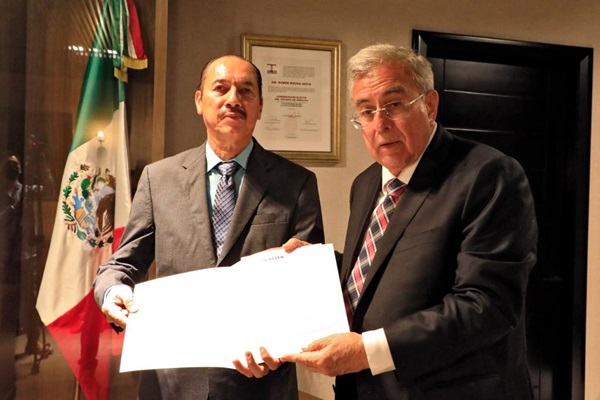 En presencia del secretario de Salud Cuitláhuac González Galindo, el mandatario estatal tomó la protesta al reconocido médico Alberto Quintero, a quien invitó a redoblar los esfuerzos en materia de la Atención Médica como lo demandan los sinaloenses y sobre todo, con la visión humanista y social con que se rige este gobierno.