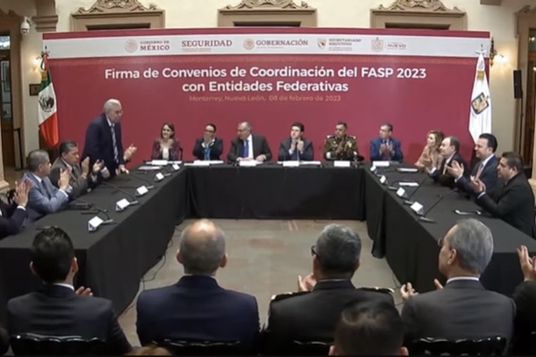 Monterrey, Nuevo León, a 8 de febrero del 2023.- El gobernador Rubén Rocha Moya, junto con otros nueve gobernadores de distintos estados del país, suscribió un convenio para la entrega de recursos del Fondo de Aportaciones para la Seguridad Pública 2023 (FASP), con el propósito de fortalecer el despliegue y equipamiento de las corporaciones de seguridad en esas entidades.
