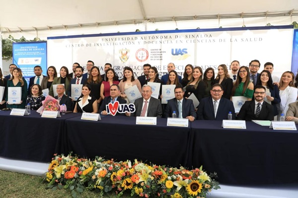 Enseguida, el gobernador del estado fue invitado por el rector de la UAS para atestiguar el acto académico de fin de cursos de especialidades médicas en su 39 generación, que llevó el nombre de la doctora Marisol Montoya Moreno, como madrina de generación de los 34 egresados, que fueron 21 especialidades, ocho subespecialidades, uno de alta especialidad y cuatro en la Licenciatura en Optometría, una de ellas precisamente la hija del rector, la joven Sofía Esmeralda Madueña Angulo, quien recibió su diploma de manos del gobernador Rocha, en compañía de sus padres, el rector, y la maestra Sofía Angulo de Madueña, directora de la Unidad de Bienestar Universitario.