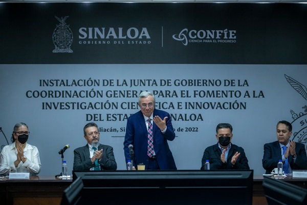 Culiacán, Sinaloa, a 15 de junio del 2022.- Con el propósito de refundar la importancia de la ciencia y la tecnología en Sinaloa, destinarle mayores recursos públicos, apoyar proyectos y formar investigadores, el gobernador Rubén Rocha Moya instaló la Junta de Gobierno de la Coordinación General para el Fomento a la Investigación Científica e Innovación del Estado de Sinaloa (CONFIE).