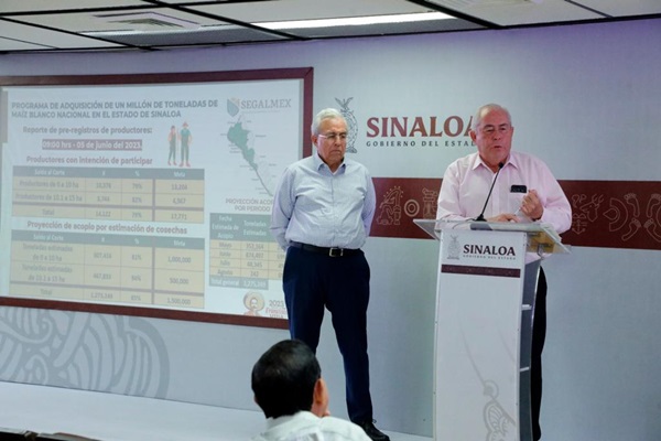Culiacán, Sinaloa, a 12 de junio de 2023.- El gobernador Rubén Rocha Moya ofreció su Conferencia Semanera acompañado por el director de SEGALMEX, Leonel Cota Montaño y su equipo de trabajo, para dar a conocer el avance que se tiene en el programa de comercialización del millón de toneladas que retirará del mercado esta dependencia, y se dio a conocer que los pagos a los productores desde una hasta 15 hectáreas a quienes se les comprará el total de su cosecha a precio de garantía de 6 mil 965 pesos, serán los días martes y sábados de cada semana, desde ahora y hasta que termine la última entrega de las cosechas, estimada hasta agosto.