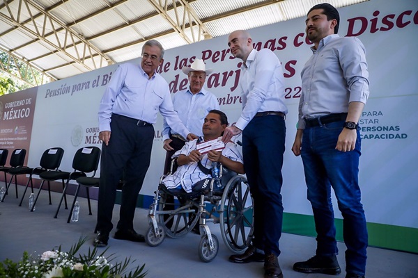 Por su parte el coordinador de los Programas del Bienestar, Carlos Torres, reconoció la voluntad del gobernador Rocha para ser el primer gobernador en sumarse a la propuesta del presidente de México, de ampliar el padrón de beneficiarios de la pensión para personas con discapacidad, programa que había iniciado para apoyar principalmente a niños y jóvenes, pues el rango de edad era de los 0 a los 29 años, y el propósito del presidente fue incluir también ese otro segmento de la población, desde los 30 a los 64 años, pues a partir de los 65 años, todos los mexicanos reciben su pensión de adultos mayores.