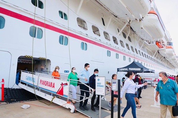 Mazatlán, Sinaloa a 27 de julio de 2022.- Con la finalidad de supervisar el cumplimiento de protocolos sanitarios internacionales, el Secretario de Salud de Sinaloa, Dr. Cuitláhuac González Galindo y la Secretaria de Turismo, Lic. María del Rosario Torres Noriega, acudieron al muelle de Mazatlán para recibir a poco más de 6 mil turistas que llegaron al crucero Carnival Panorama.