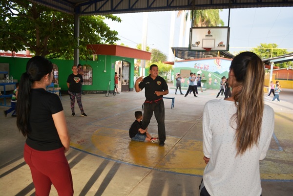 El Policía y Profesor, José Luis Álvarez Durán les enseña cómo defenderse de un ataque a su integridad física en el programa Defensa Personal a mujeres, por una mujer más segura; la sede, escuela Club de Leones.