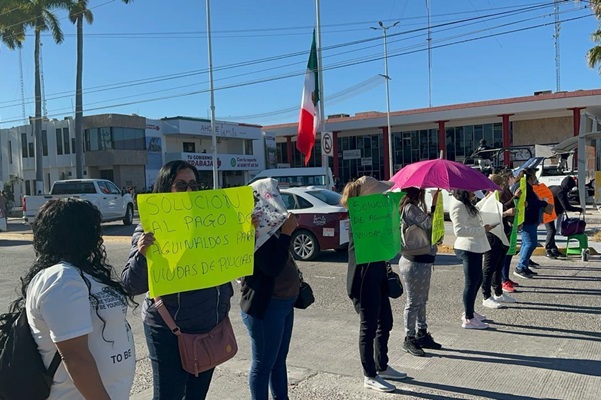 Los Mochis, Sinaloa. En el tercer día de manifestaciones, viudas de policías, intensificaron sus medidas de protesta bloqueando calles cercanas al Palacio Municipal en Ahome.